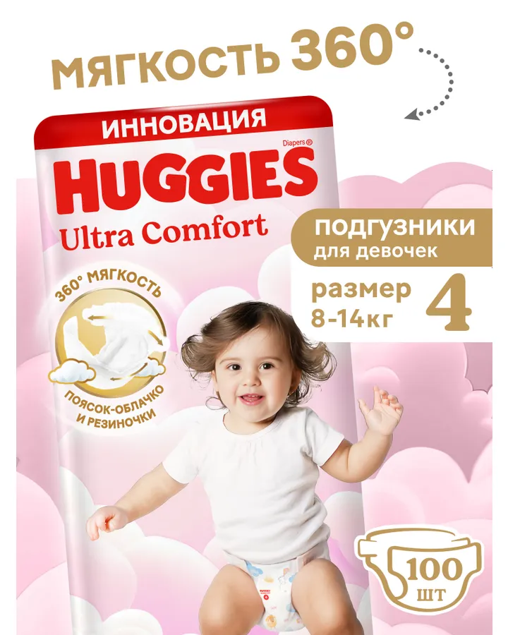 5Подгузники Huggies Ultra Comfort для девочек 4 (8-14 кг) 100 шт.Хорошие подгузники тонкие аллергию не вызывают берем уже второй раз