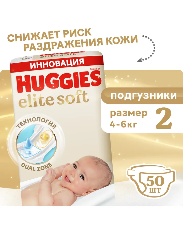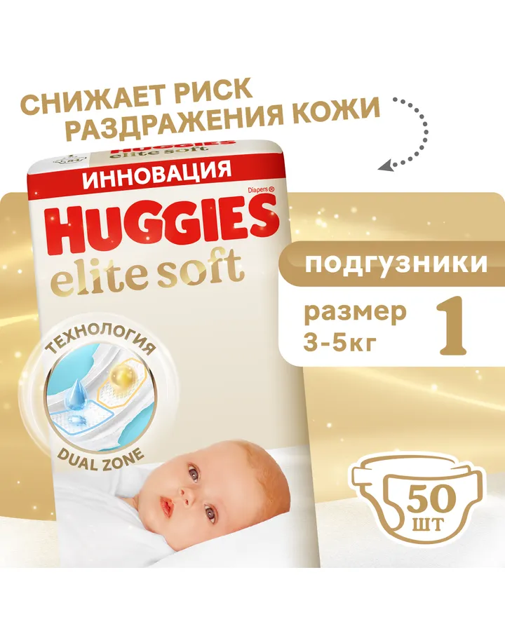 Подгузники Huggies Elite Soft для новорожденных 1 (3-5 кг) 50 шт.Самые лучшие памперсы. Впитывают хорошо, попка малышки сухая