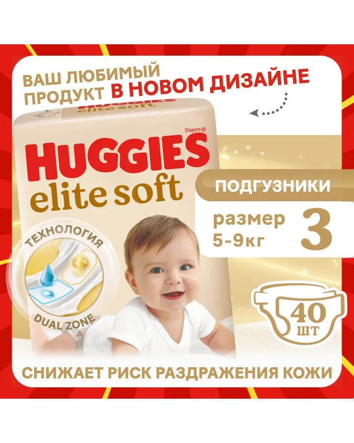 5Подгузники Huggies Elite Soft 3 (5-9 кг) 40 шт.Самые лучшие подгузники. И на ночь не текут и день 10 из 10