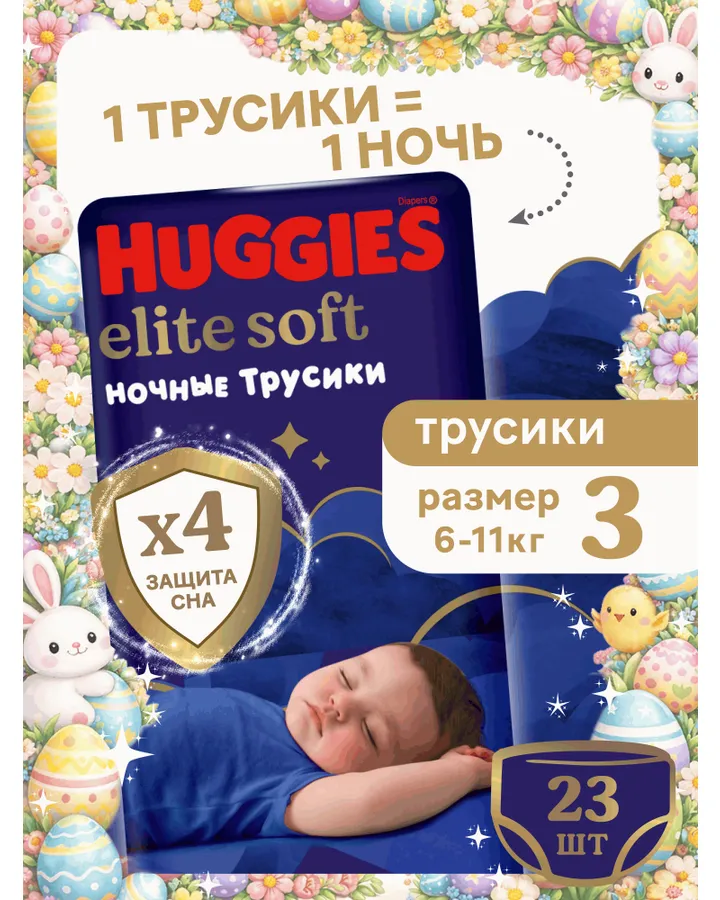 5Трусики Huggies Elite Soft ночные 4 (9-14 кг) 19 шт.Нам очень нравятся эти подгузники. Покупаем постоянно