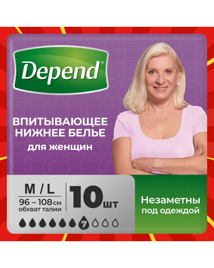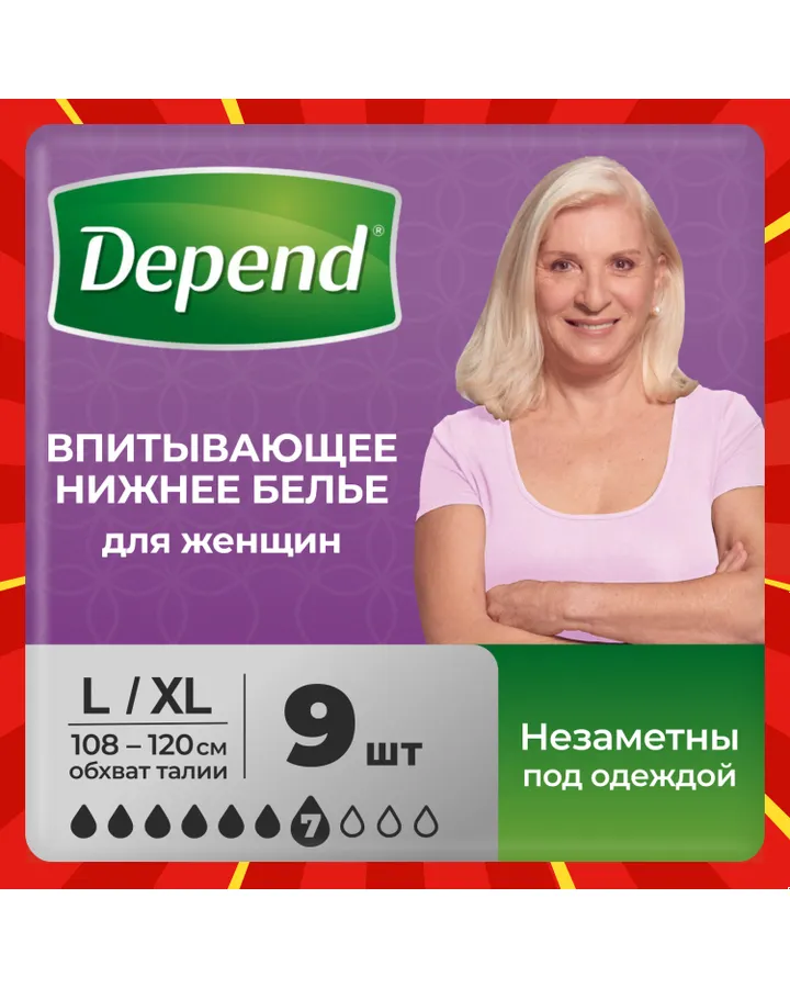 5Впитывающее белье Depend L/XL 9 шт.Только положительные. Бельё чистое, ты не переживаешь,что окажешься в луже.Пачки хватает для роддома и даже ещё остаётся несколько штук,так как дополнительно брала прокладки.