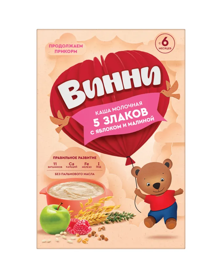 Каша Винни молочная 5 злаков яблоко-малина 200г 6месяцев