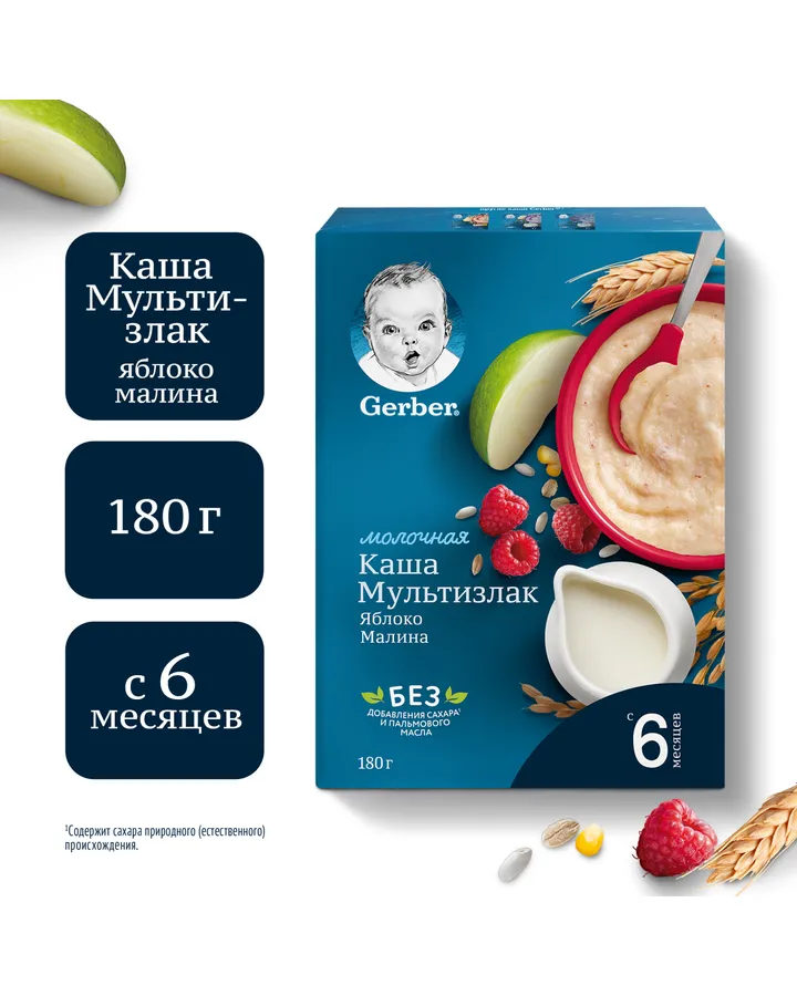 Каша молочная Gerber мультизлаковая с яблоком и малиной 180г с 6месяцев