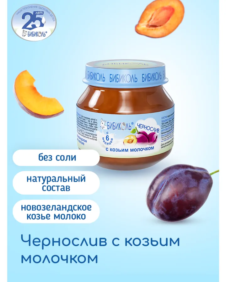 5Пюре Бибиколь Чернослив-козье молочко с 6 мес 80 гКоза чувствуется. На любителя (это я;) Дети едят в охотку. Попробовать однозначно стОит.