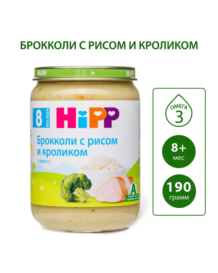 5Пюре Hipp Брокколи-рис-кролик с 8 мес 190 гРебёнок ест с удовольствием, этот продукт практически главное его предпочтение.