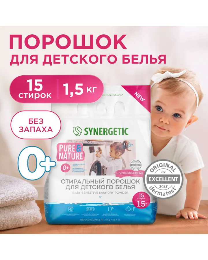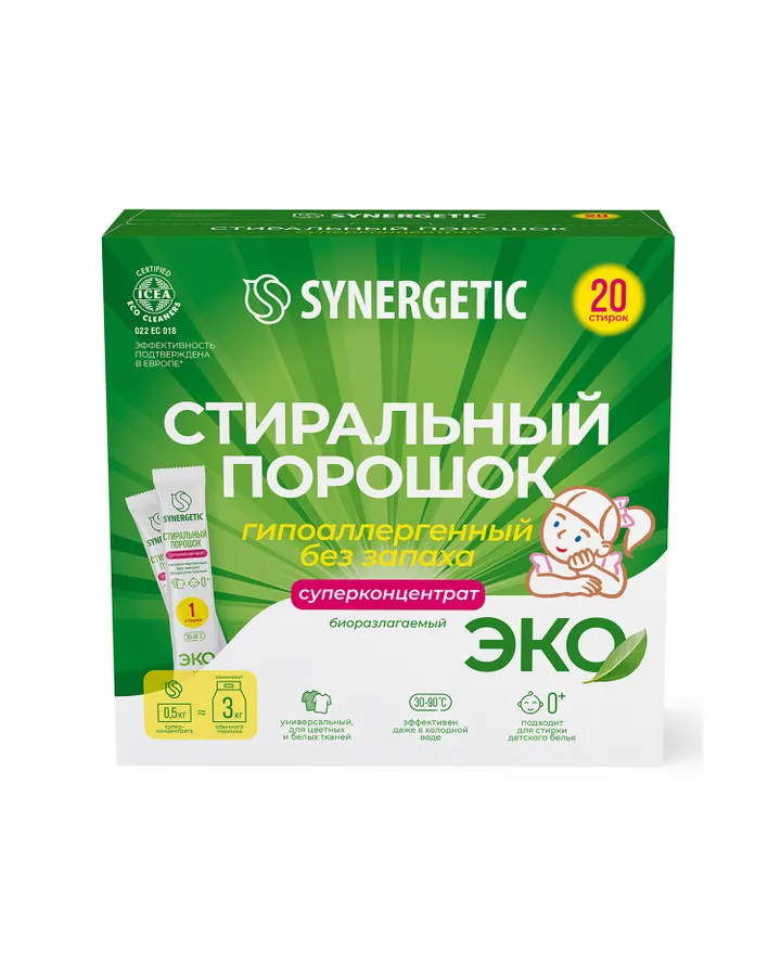 5Стиральный порошок Synergetic 20 шт.Прекрасный порошок для белья. Хорошо отстирывает, запаха порошка нет.