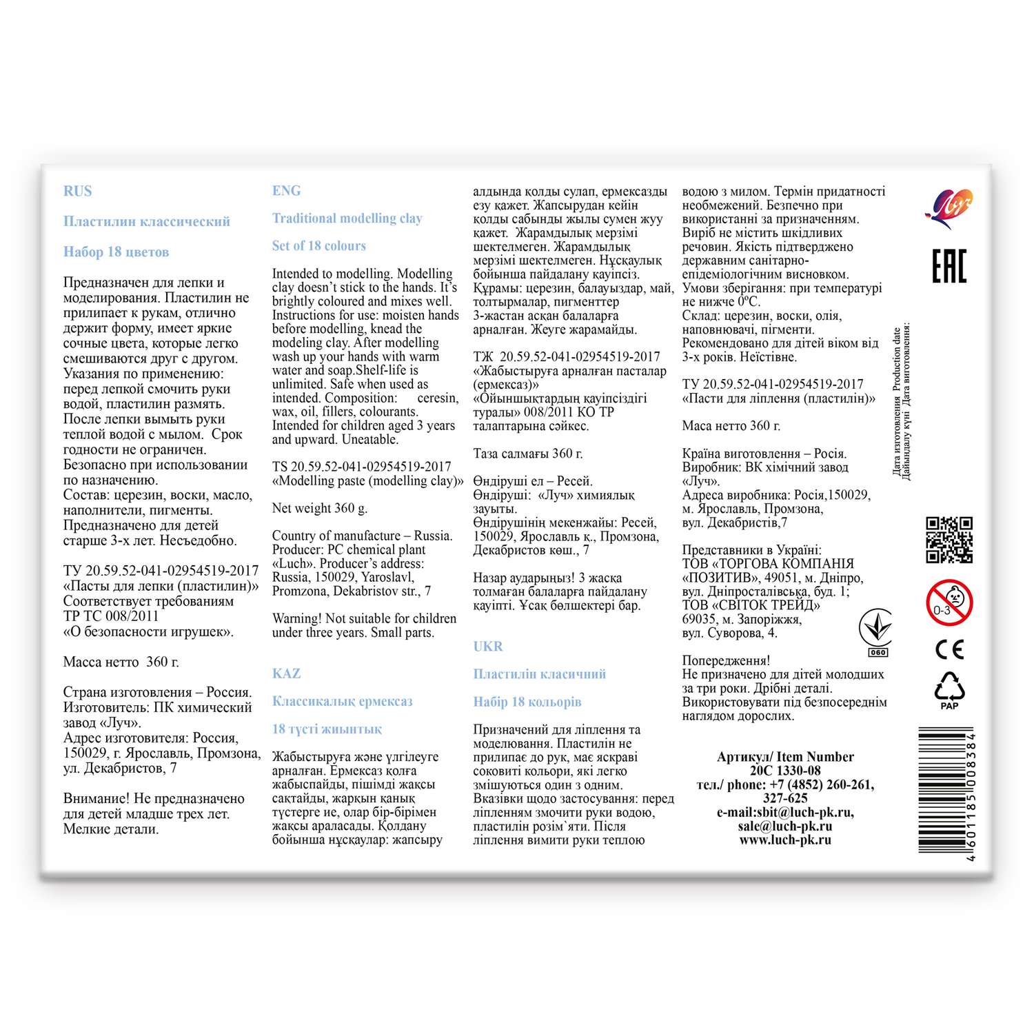 Цена на Пластилин Луч 18 цв. - 1890 ₸.