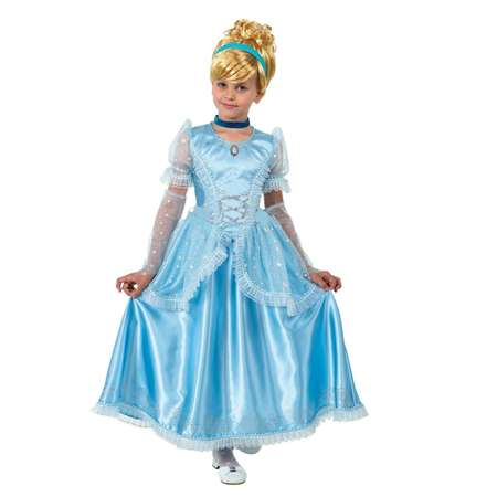 В комплект входит платье голубого цвета, перчатки, ожерелье, брошь с изображением Принцессы Золушки, парик и обруч.
