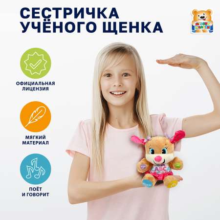 Малыш будет в восторге от этой очаровательной и очень мягкой девочки-щенка, которую так приятно обнимать. У игрушки милая мордочка с вышитыми глазками и длинные ушки из цветного материала. Щенок выполняет несколько обучающих функций, он станет для ребёнка хорошим учителем и добрым другом, который расскажет интересные стихи, споёт песенки, поможет выучить цифры и цвета.