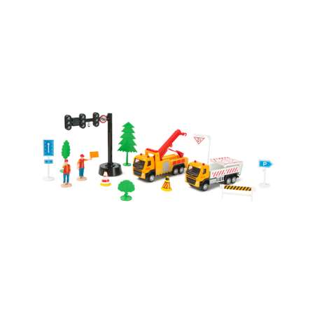 Набор Mobicaro «Дорожные работы» предназначен для увлекательных сюжетно-ролевых игр, посвященных важной работе городских служб. В комплекте — два грузовых автомобиля Volvo, один из которых с поднимающейся стрелой. Обе выполнены с применением литого металла, что придает им прочность и солидность, а пластиковые элементы обеспечивают точность в передаче мелких деталей. Достаточно откатить машину назад и отпустить, чтобы она самостоятельно поехала вперед. В комплект входят две фигурки рабочих, что позволяет ребенку непосредственно управлять действиями героев и разыгрывать различные операции. Дополнительный набор дорожных знаков помогает организовать подъездные пути вокруг участка, на котором ведутся работы, и моделировать различные дорожные ситуации, обучая в процессе основам безопасности.