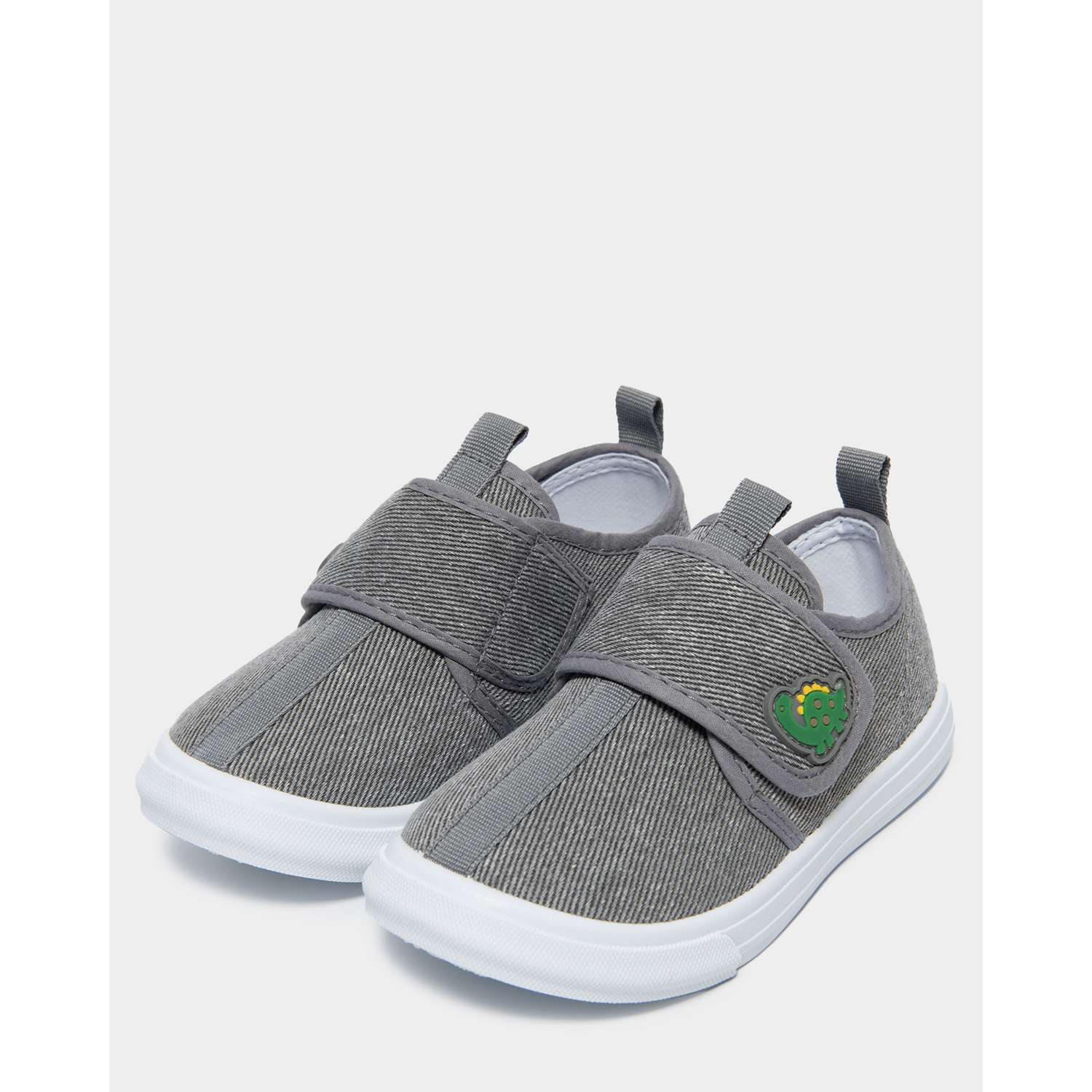 Текстильные кеды для мальчика Tombi серого цвета, декорированные нашивкой в виде динозаврика.