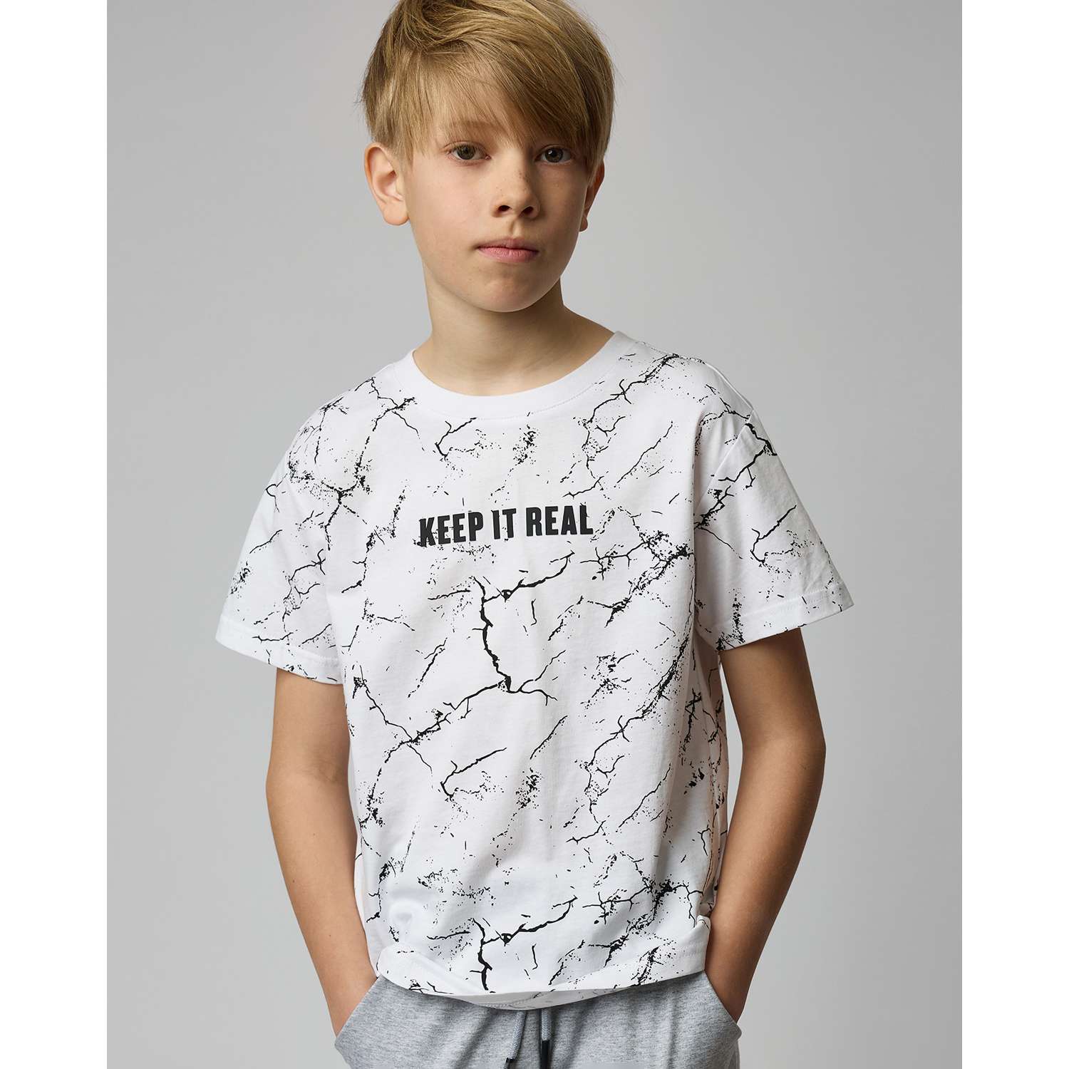 Белая футболка для мальчика Futurino с надписью "Keep it real".
