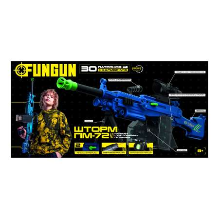 Игрушечный пулемёт Fungun «Шторм ПМ-72» предоставляет невероятно реалистичный игровой опыт. Комплект включает 72 компонента, среди которых ствол, кронштейн, регулируемая оптика, два типа прицелов — оптический и инфракрасный, а также 30 мягких пуль и гильз к ним. Для удобства и полного погружения в игру в набор входят защитные очки и плечевой ремень.