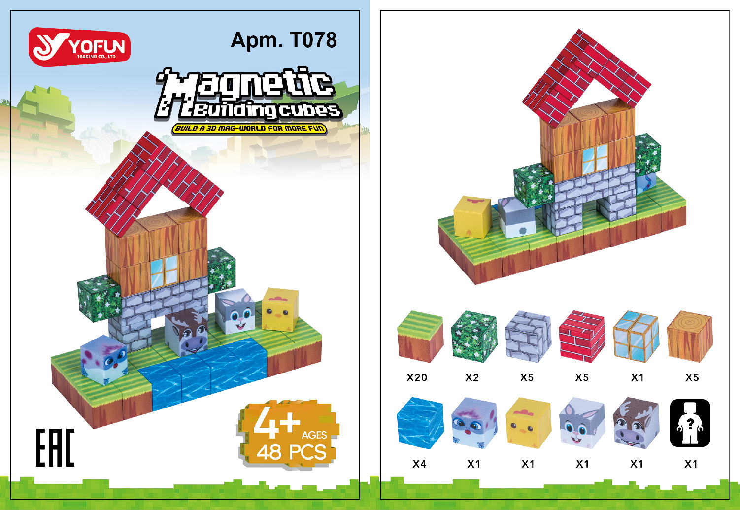 - Конструктор содержит 48 элементов (46 магнитных блоков, 1 фигурка человечка и инструкция).