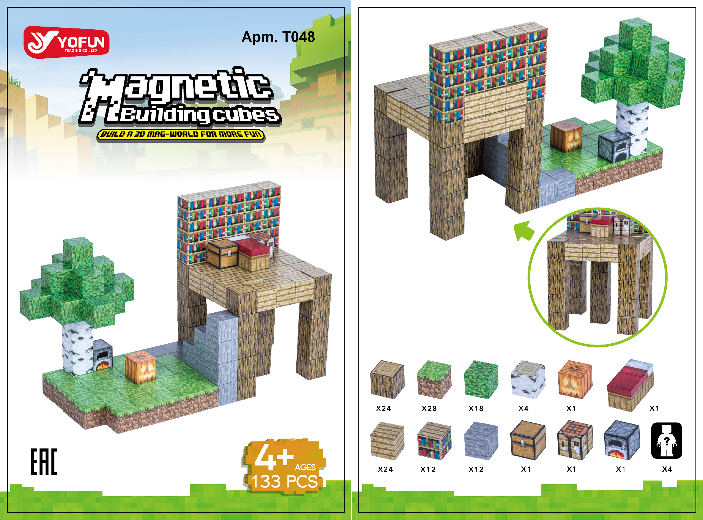 - Конструктор содержит 133 элемента (128 магнитных блоков, 4 фигурки человечков и инструкция).