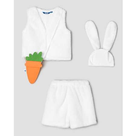 Плюшевый карнавальный костюм Grimmo "Зайчик" из четырёх предметов: жилета, шорт с хвостиком, шапочки с ушками и сумки в виде морковки.