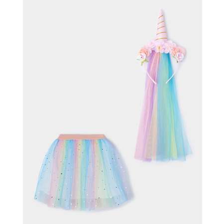 Карнавальный костюм для девочки Grimmo "Единорог" из двух предметов: пышной цветной юбочки с блёстками и ободка с объёмным цветочным декором, дополненным цветной фатой.