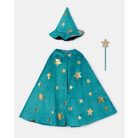 Карнавальный костюм Grimmo "Волшебник" в бирюзовом цвете из трёх предметов: велюровой мантии с золотистыми звёздами, конусной шляпы в тон и волшебной палочки.