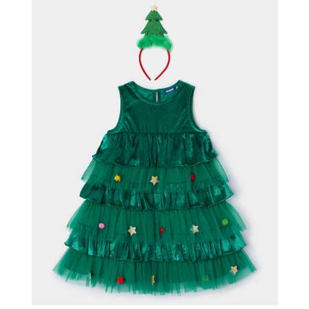 Костюм для карнавалов и праздников "Ёлочка" от Grimmo из двух предметов: ободка с объёмным блестящим декором и пышного ярусного платья с цветными декоративными элементами-украшениями.