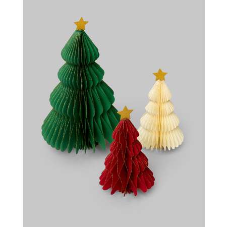 Набор включает три ёлочки разных размеров — зелёную, красную и кремовую. Каждая украшена блёстками и золотой звездой на верхушке. Изготовленные из плотной бумаги в технике аккордеона, они отлично держат форму и безопасны в использовании. Идеально подходят для украшения детской комнаты, полок, шкафчиков.