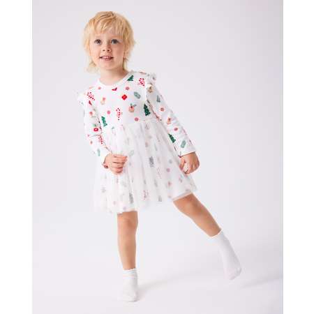 Новогоднее платье-боди для девочки Моя Горошинка в белом цвете с пышной юбочкой. Декорировано оборками и цветным принтом.