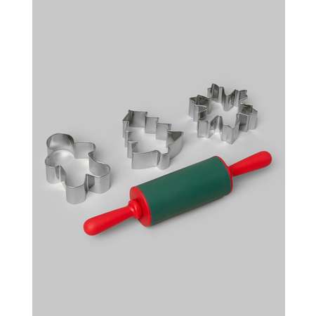 В наборе металлические формы из нержавеющей стали - в виде ёлочки, снежинки и человечка. А также силиконовая скалка. Все элементы выполнены из безопасных материалов и легко моются — идеально подойдут для совместного творчества с детьми.