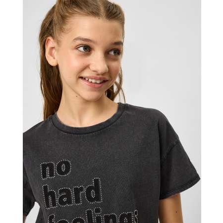 Чёрная футболка для девочки Futurino с надписью "No hard feelings", декорированная стразами.