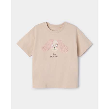 Футболка в бежевом цвете для девочки Futurino, декорированная вышивкой и принтом с собачкой.