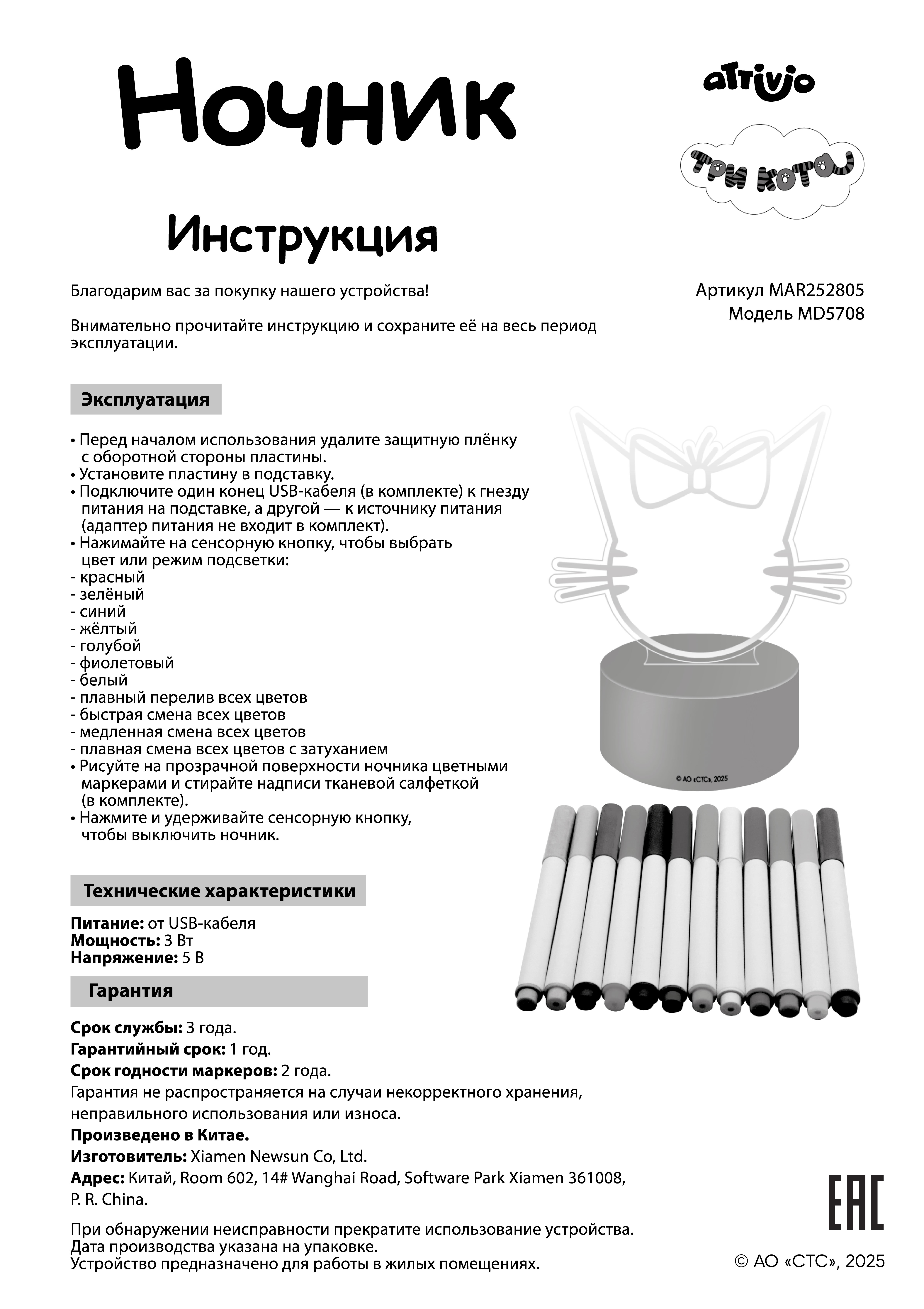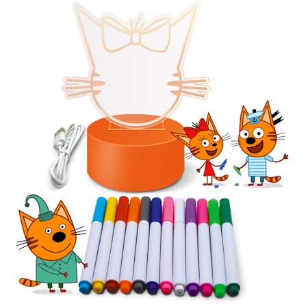 Ночник-планшет для рисования Attivio × «Три кота» в виде милого котика обязательно порадует маленького художника. Просто подсоедините ночник к источнику питания с помощью USB-кабеля (в комплекте) и наслаждайтесь переливами цвета. На котике можно писать и рисовать 12 цветными маркерами из набора и стирать надписи тканевой салфеткой (в комплекте).