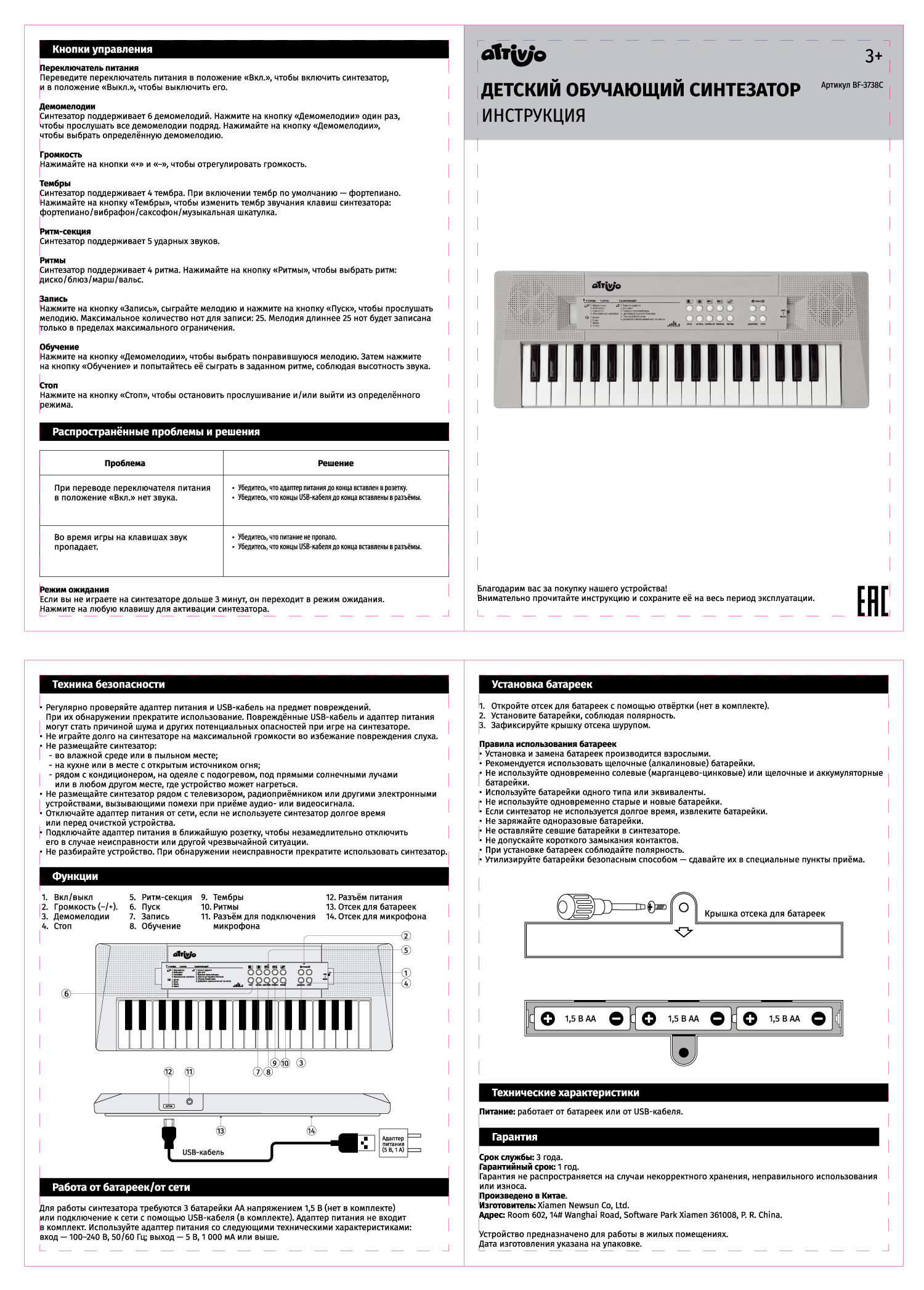 Для работы синтезатора требуются 3 батарейки АА напряжением 1,5 В (нет в комплекте) или подключение к сети с помощью USB-кабеля (в комплекте). Подходит для детей от 3 лет.