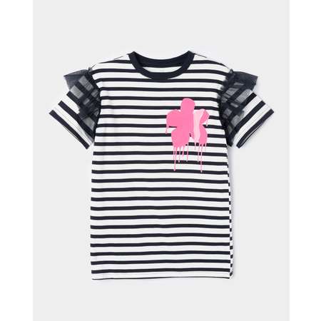 Полосатое платье для девочки Futurino Fashion с фатиновыми оборками и ярким цветочным принтом.