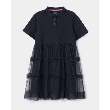Чёрное платье-поло для девочки Futurino Fashion, декорированное пышной юбкой и цветным принтом на спинке.