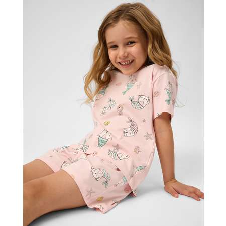 Нежно-розовый пижамный комплект для девочки Futurino из футболки шорт, декорированных цветным принтом.