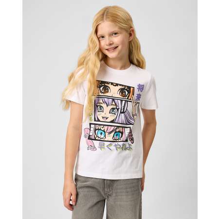 Белая футболка для девочки Futurino с ярким принтом в стиле аниме-граффити.