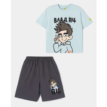 Пижамный комплект для мальчика А4 из серых шорт и синей футболки с цветным принтом "Влад Бумага".