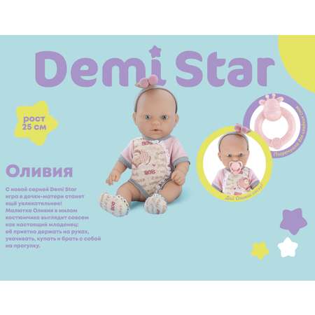 Знакомьтесь, Оливия — кукольная малышка 25 см из новой серии Demi Star, которая легко станет любимицей вашей дочки. Она выглядит совсем как настоящий новорождённый, и играть с ней — одно удовольствие: Оливию приятно держать на руках, кормить, купать, укачивать и брать с собой на прогулку.