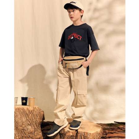 Однотонные широкие брюки-карго для мальчика Futurino Fashion в бежевом цвете, с накладными карманами.