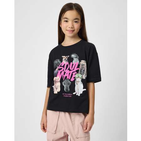 Чёрная футболка для девочки Futurino с цветным принтом "Soul mate".