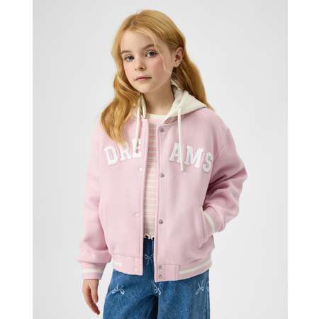 Тёплый бомбер для девочки Futurino в розовом цвете, с белым капюшоном. Декорирован объёмной надписью "Dreams".