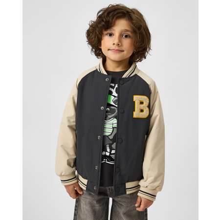 Куртка-бомбер для мальчика Futurino в сером цвете, с объёмной нашивкой и надписями на спинке.
