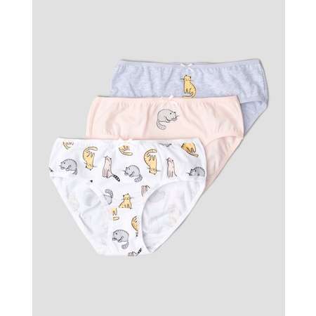В комплекте Futurino три модели трусов для девочки, декорированные принтом с котиками - серые, светло-розовые и белые.