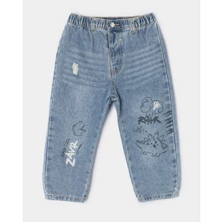 Джинсы для мальчика BabyGo Trend голубого цвета с декоративными потёртостями и контрастным принтом.