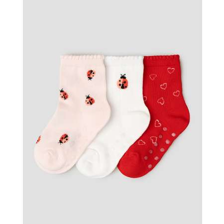В комплекте BabyGо три пары носков для девочки - розовые и белые с божьими коровками, а также красные с сердечками.