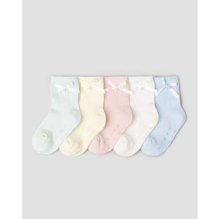 В комплекте BabyGо пять пар однотонных носков для девочки, декорированных бантиками - светло-зелёные, жёлтые, белые, розовые и голубые.