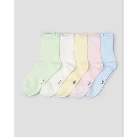 В комплекте Futurino пять однотонных носков в рубчик для девочки - зелёные, белые, жёлтые, розовые и голубые.