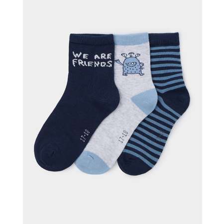 В комплекте Futurino три пары носков для мальчика - тёмно-синие с надписями, серые с цветным принтом и полосатые.