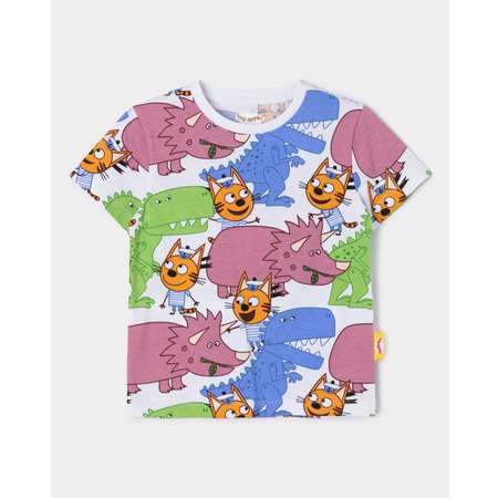 Белая футболка для мальчика Три кота с красочным принтом "Коржик и динозавры".