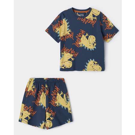 Тёмно-синий пижамный комплект для мальчика Futurino из футболки и шорт, декорированных принтом с динозаврами.