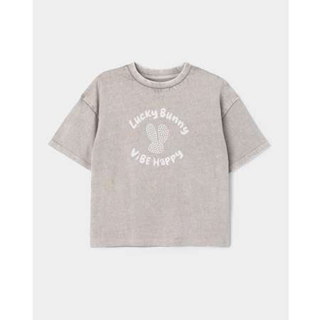 Серая футболка для девочки Futurino, декорированная однотонными стразами и принтом с надписью.