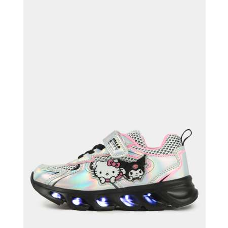 Серебристые кроссовки для девочки Hello Kitty с голографическим эффектом и подсветкой на подошве.